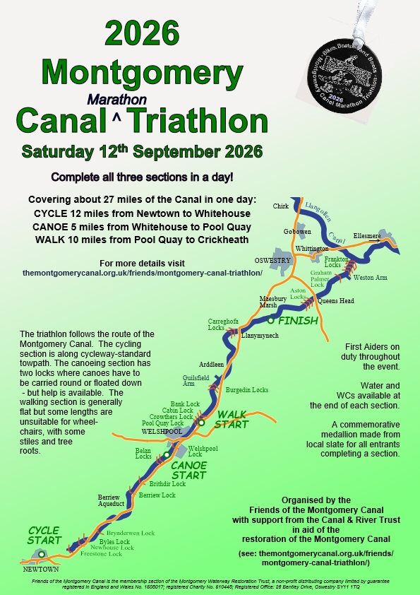 The Triathlon is organised by the Friends of the Montgomery Canal and supported by the Canal & River Trust in aid of the restoration of the Montgomery Canal. It is one of the most popular cross border events, starting in Newtown in Wales and ending near Oswestry in Shropshire.