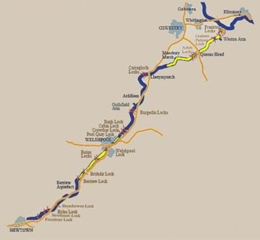 The Montgomery Canal connects to the main canal network at Frankton Junction, between Oswestry and Ellesmere in Shropshire, and ends at Newtown in Powys, following a route past Maesbury – near Oswestry, Llanymynech and Welshpool. Some sections of the canal are still dry and the southern section is cut off from the main canal network, which is why the Monty is the subject of major restoration works.